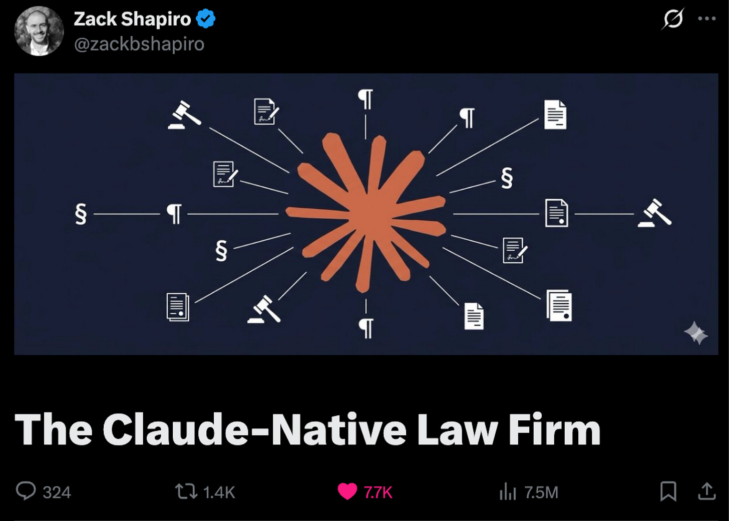 Last week, Zack Shapiro published a post on X called “The Claude-Native Law Firm.” If you’re reading this newsletter, you probably saw it. Over 7.5 million people did. More than 320 comments. Thousands of reactions, and lawyers reaching out to him directly. For context, there are about 1.3 million lawyers in the United States. This wasn’t a legal tech moment. It was a cultural moment — a signal that the anxiety around AI and professional work had been waiting for someone to say: here’s a path forward, and it’s not as scary as you think.