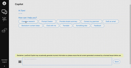 Copilot can help you with basic legal research, summarizing information, correcting grammar and drafting letters and emails. It is powered by OpenAI and the LawDroid Builder no code automation platform.