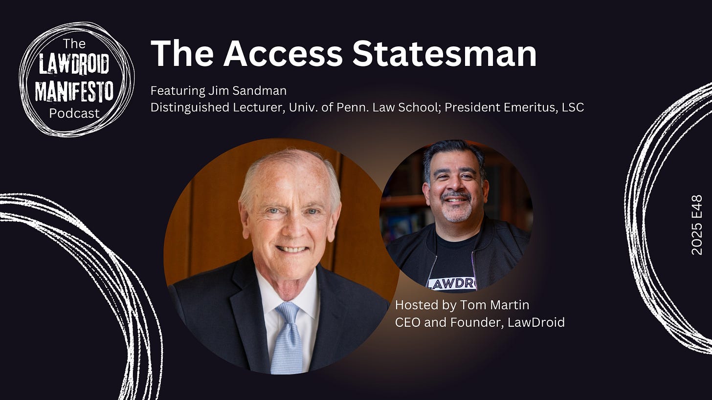 Jim Sandman, President Emeritus of Legal Services Corporation and current University of Pennsylvania Law School faculty member, shares his remarkable journey from a childhood in Albany shaped by parents who emphasized service, through 30 years at Arnold & Porter where he became managing partner, to finding his true calling leading the nation’s largest civil legal aid funder. Throughout the conversation, Jim reveals pivotal moments that shaped his path, from early pro bono work defending Vista volunteers to a chance conversation with a D.C. schools chancellor that led to his general counsel role there, ultimately preparing him for his transformative work at LSC. Jim’s optimism about AI’s potential to expand access to justice is grounded in decades of experience understanding the gap between those who can afford legal services and those who cannot. He now teaches courses on AI and Access to Justice, professional responsibility, and leadership in law, while continuing to advocate for regulatory reform, simplified procedures, and the wise use of technology to put the law in the hands of the people.