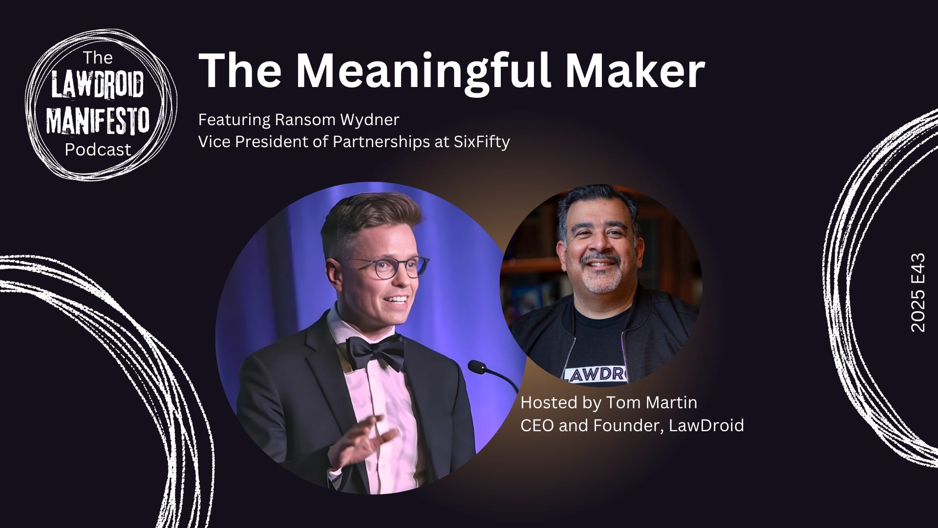 Ransom Wydner, VP of Partnerships at SixFifty, shares his journey from small-town beginnings through music to technology leadership, now bridging the worlds of HR tech innovation and access to justice. With his affable nature and innovative spirit, Ransom discusses how AI is affecting both commercial and nonprofit legal tech spaces differently, creating both challenges and opportunities. He emphasizes the increasing importance of unique data sets and competitive advantages as AI capabilities become commoditized—what seemed revolutionary a year ago is now available to everyone for free or $20 a month. Throughout the conversation, Ransom shares his philosophy on work-life balance, the importance of truly disconnecting during time off, and what makes work meaningful: the privilege of creating something that lasts beyond your own lifetime, whether it’s a song, a tool, or an impact on someone’s life.
