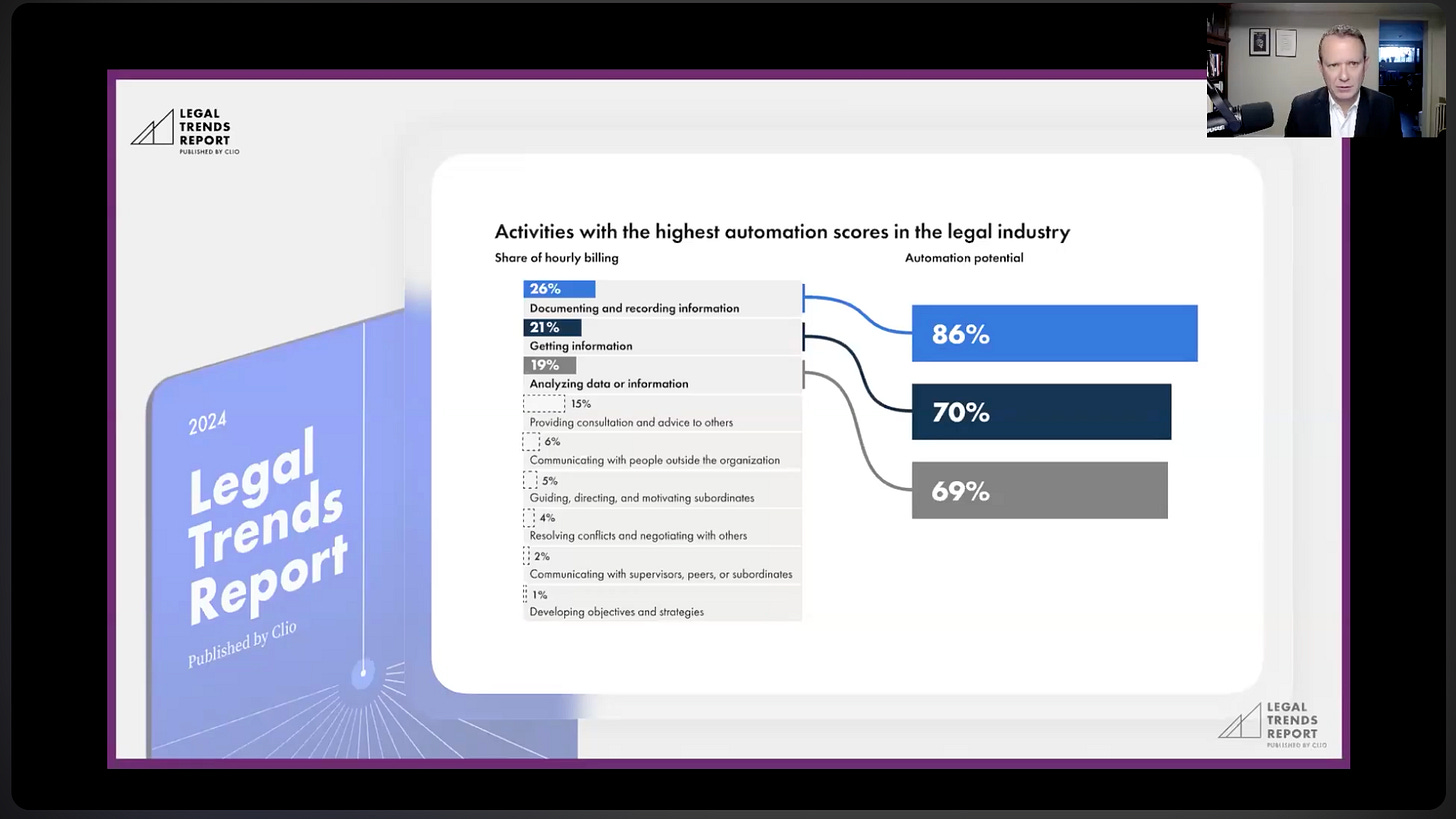 The AI Reckoning (2024): Then came the bombshell. Analyzing over 7 million time entries, Clio found that 74% had strong automation potential. The three highest categories, documenting information (drafting), getting information (client communication and research), and analyzing data, accounted for 66% of all time entries. These are core activities and AI can now handle much of the heavy lifting.