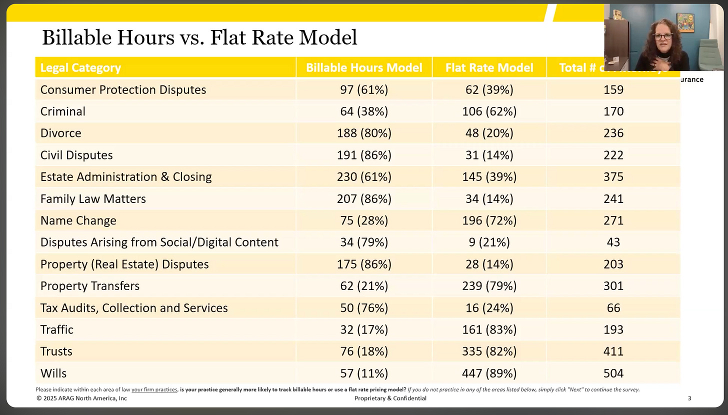 ARAG’s annual attorney survey revealed significant movement toward flat-fee arrangements, particularly in transactional areas. While family law still leans on billable hours due to unpredictability, the trend is clear: as AI tools enable greater efficiency, more attorneys are exploring alternative billing structures to capture that value.